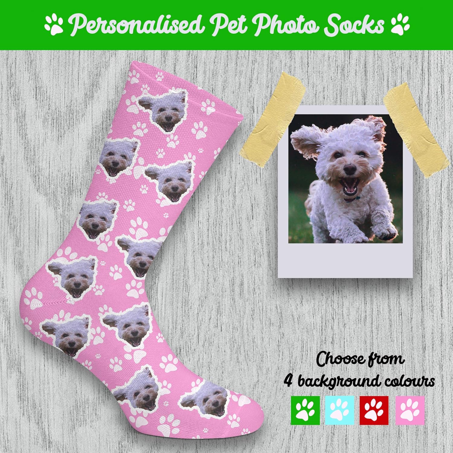Simply upload your pet's picture and we'll design & ship your custom pet socks the next day! Browse our full collection of personalised dog socks. Personalized socks with dog face printed. Personalize socks with pictures of your dog's face printed all over them.